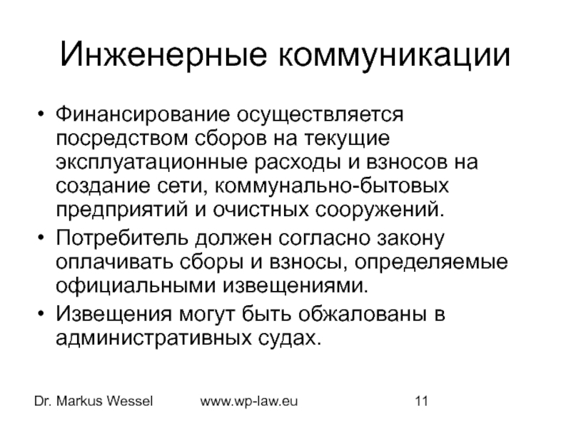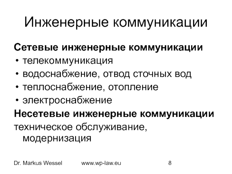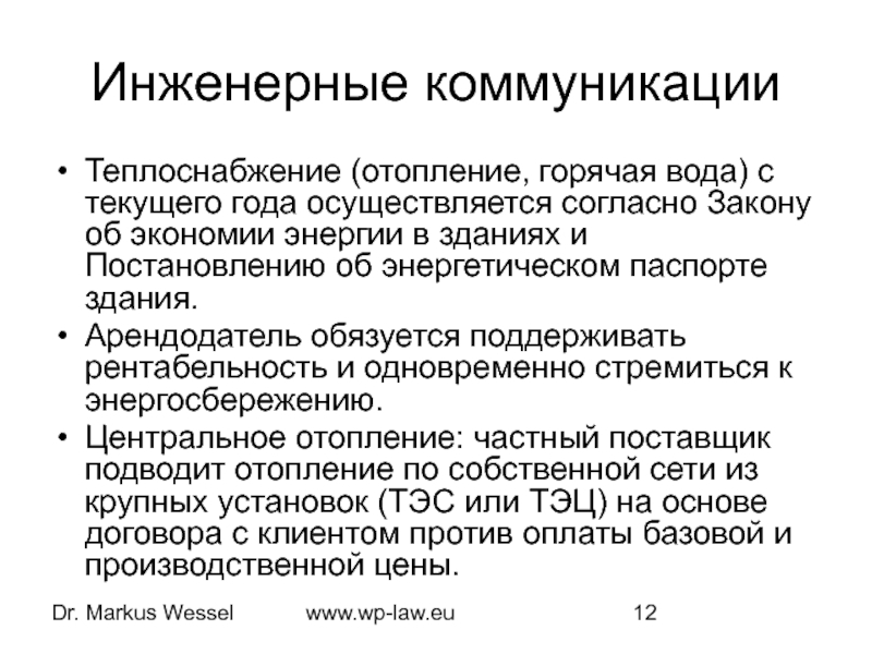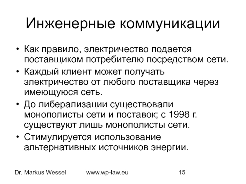 Инженерные коммуникации (не вкл. содержание) осуществляется на либерализованном рынке посредством сетевого или несетевого снабжения; клиент решает, кто и по какой цене его снабжает.