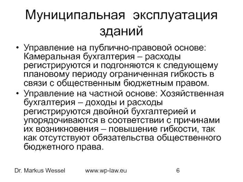 Управление на частной основе: Хозяйственная бухгалтерия – доходы и расходы регистрируются двойной бухгалтерией и упорядочиваются в соответствии с причинами их возникновения – повышение гибкости, так как отсутствуют обязательства общественного бюджетного права.