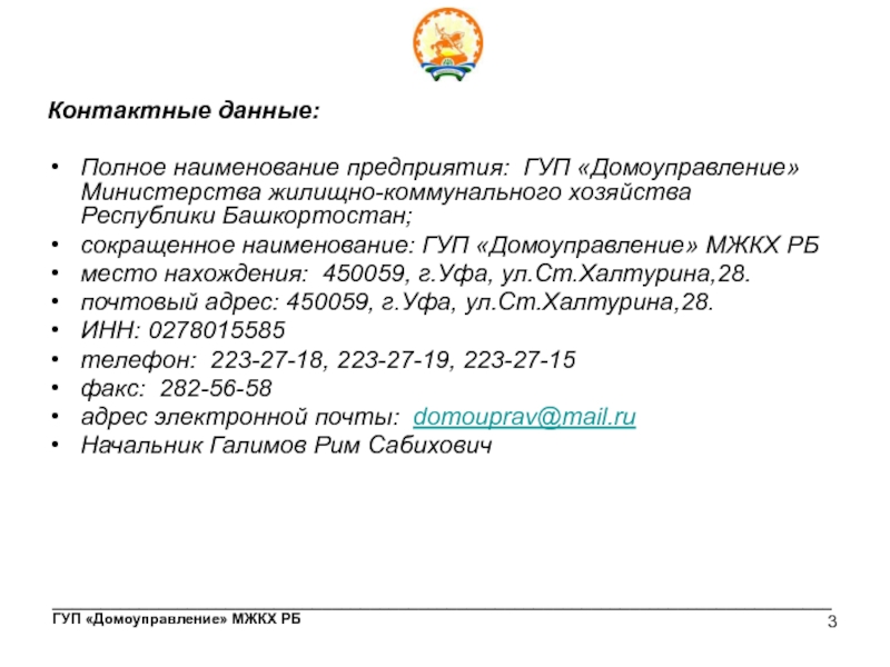 Государственное унитарное предприятие Домоуправление Министерства жилищно-коммунального хозяйства Республики Башкортостан презентация