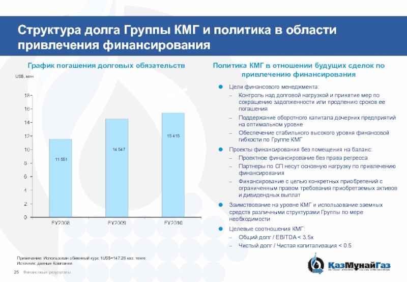 В 2010 г. КМГ успешно разместил еврооблигации на сумму US$1.5 млрд. (срок 10 лет, купон 7,25%) и US$1.25 млрд. (срок 10,5 лет, купон 6,375%), получил внутренний займ от РД КМГ на сумму US$1.5 млрд. (срок 3 года, купон 7%), разместил бескупонные облигации на сумму 100 млрд. тенге (срок 7 лет, эффективная ставка 7%).