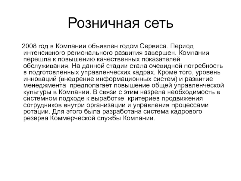 интенсивного регионального развития завершен. Компания перешла к повышению качественных показателей обслуживания. На данной стадии стала очевидной потребность в подготовленных управленческих кадрах. Кроме того, уровень инноваций (внедрение информационных систем) и развитие менеджмента предполагает повышение общей управленческой культуры в Компании. В связи с этим назрела необходимость в системном подходе к выработке критериев продвижения сотрудников внутри организации и управления процессами ротации. Для этого была разработана система кадрового резерва Коммерческой службы Компании.