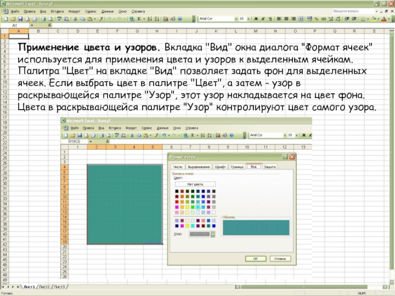 Слайд 26Применение цвета и узоров. Вкладка "Вид" окна диалога "Формат ячеек" используется