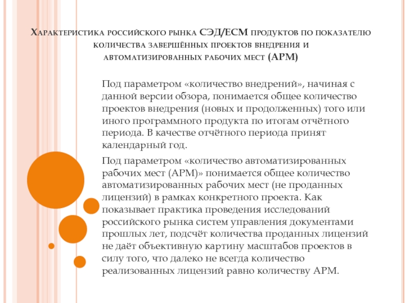 Под параметром «количество автоматизированных рабочих мест (АРМ)» понимается общее количество автоматизированных рабочих мест (не проданных лицензий) в рамках конкретного проекта. Как показывает практика проведения исследований российского рынка систем управления документами прошлых лет, подсчёт количества проданных лицензий не даёт объективную картину масштабов проектов в силу того, что далеко не всегда количество реализованных лицензий равно количеству АРМ.