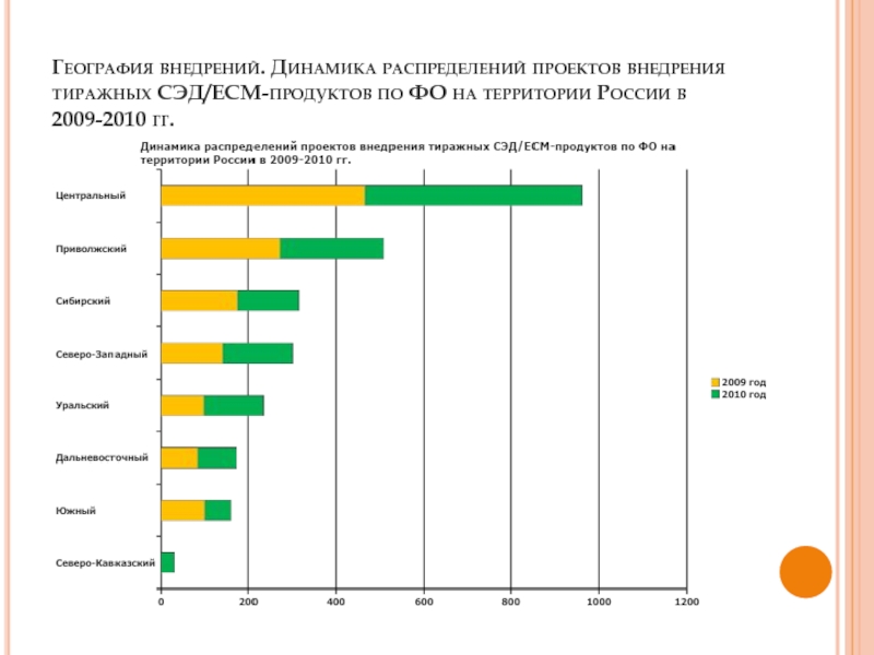 В остальных регионах было отмечено снижение активности внедрений СЭД, наибольший спад наблюдался в Сибирском ФО – лишь 80% от показателя 2009 года.