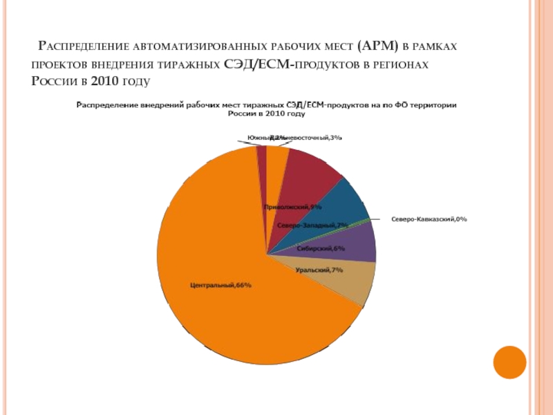По количеству автоматизированных рабочих мест (АРМ) также лидирует DIRECTUM (+4600 АРМ), а в процентном выражении – у продукта NauDoc (в 30 раз). Таким образом, в 2010 году зафиксирован уверенный рост количества автоматизированных компаний посредством СЭД, а также существенно увеличилось число АРМ в рамках проектов внедрения.