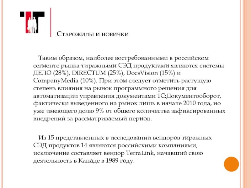 Из 15 представленных в исследовании вендоров тиражных СЭД продуктов 14 являются российскими компаниями, исключение составляет вендор TerraLink, начавший свою деятельность в Канаде в 1989 году.