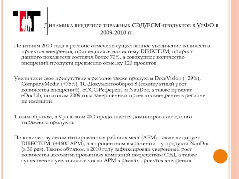 Увеличили своё присутствие в регионе также продукты DocsVision (+29%), CompanyMedia (+75%), 1C-Документооборот 8 (семикратный рост количества внедрений), БОСС-Референт и NauDoc, а также продукт eDocLib, по итогам 2009 года завершённых проектов внедрения в регионе не имевший.