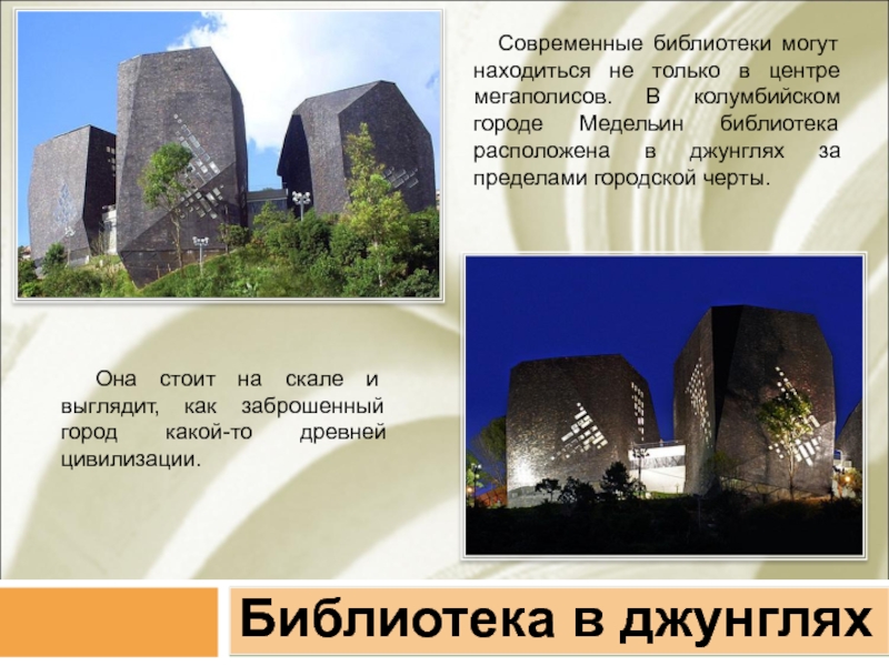 центре мегаполисов. В колумбийском городе Медельин библиотека расположена в джунглях за пределами городской черты.