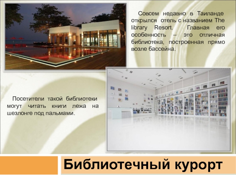 library Resort. Главная его особенность – это отличная библиотека, построенная прямо возле бассейна.