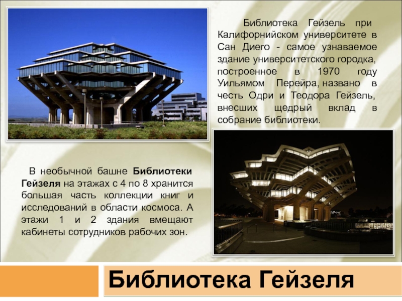 - самое узнаваемое здание университетского городка, построенное в 1970 году Уильямом Перейра, названо в честь Одри и Теодора Гейзель, внесших щедрый вклад в собрание библиотеки.