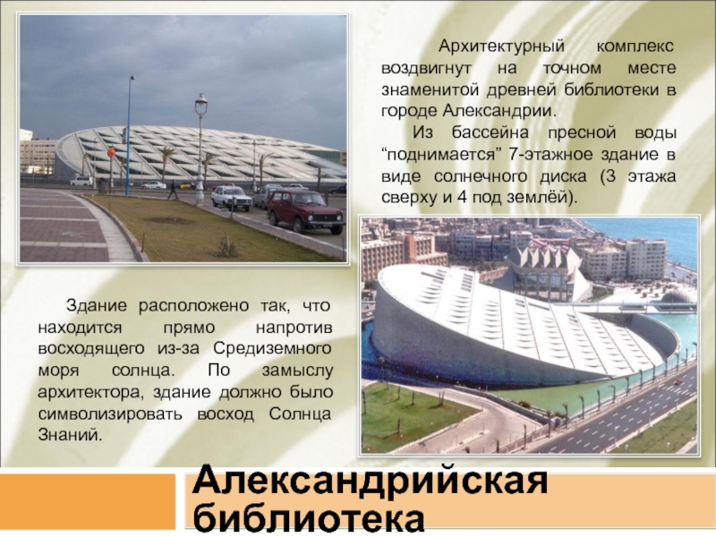 Здание расположено так, что находится прямо напротив восходящего из-за Средиземного моря солнца. По замыслу архитектора, здание должно было символизировать восход Солнца Знаний.