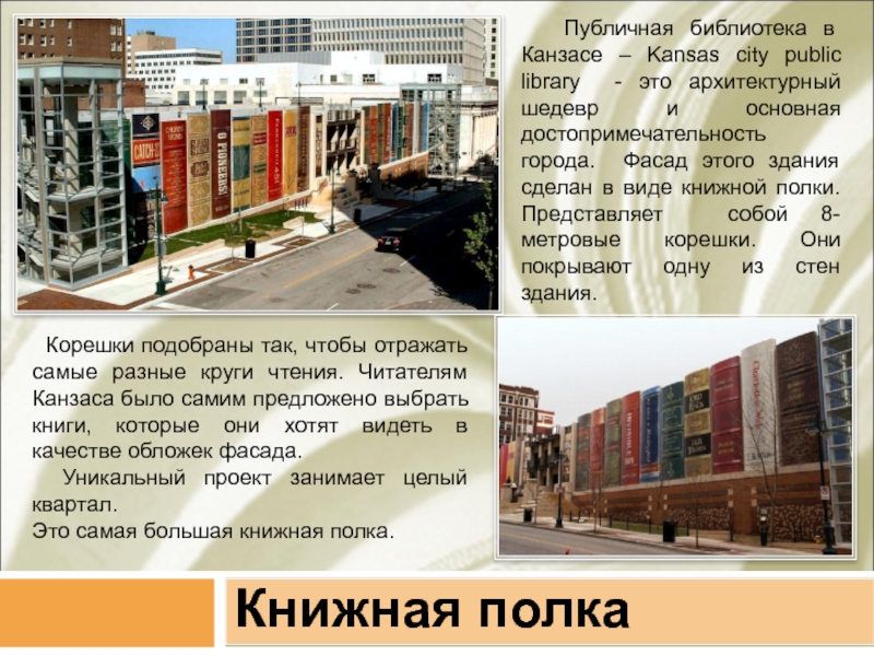 Корешки подобраны так, чтобы отражать самые разные круги чтения. Читателям Канзаса было самим предложено выбрать книги, которые они хотят видеть в качестве обложек фасада.