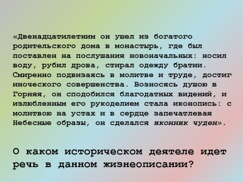 Слайд 18«Двенадцатилетним он ушел из богатого родительского дома в монастырь, где был