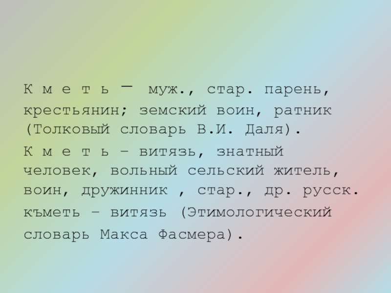 К м е т ь – витязь, знатный человек, вольный сельский житель, воин, дружинник , стар., др. русск.