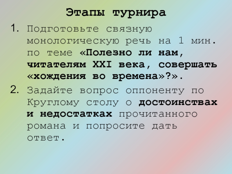 Задайте вопрос оппоненту по Круглому столу о достоинствах и недостатках прочитанного романа и попросите дать ответ.