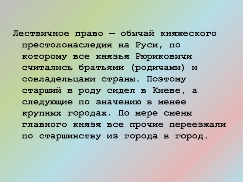 Слайд 22Лествичное право — обычай княжеского престолонаследия на Руси, по которому все
