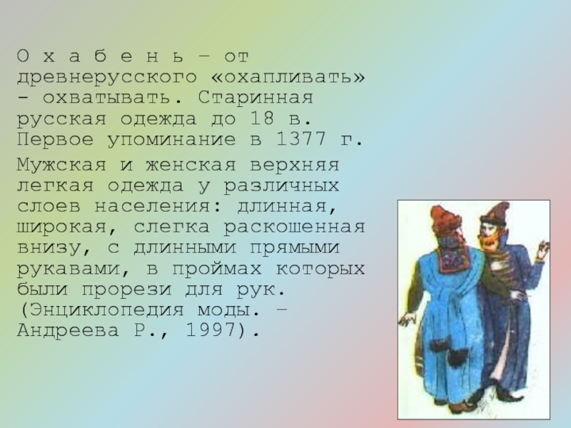 охватывать. Старинная русская одежда до 18 в. Первое упоминание в 1377 г.