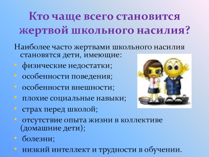 Слайд 10Кто чаще всего становится жертвой школьного насилия?