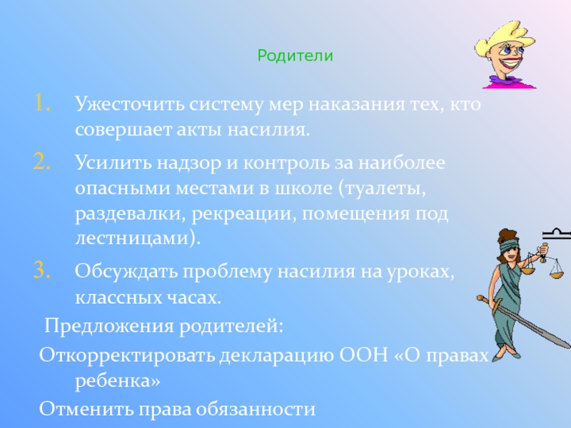 Слайд 20Ужесточить систему мер наказания тех, кто совершает акты насилия.