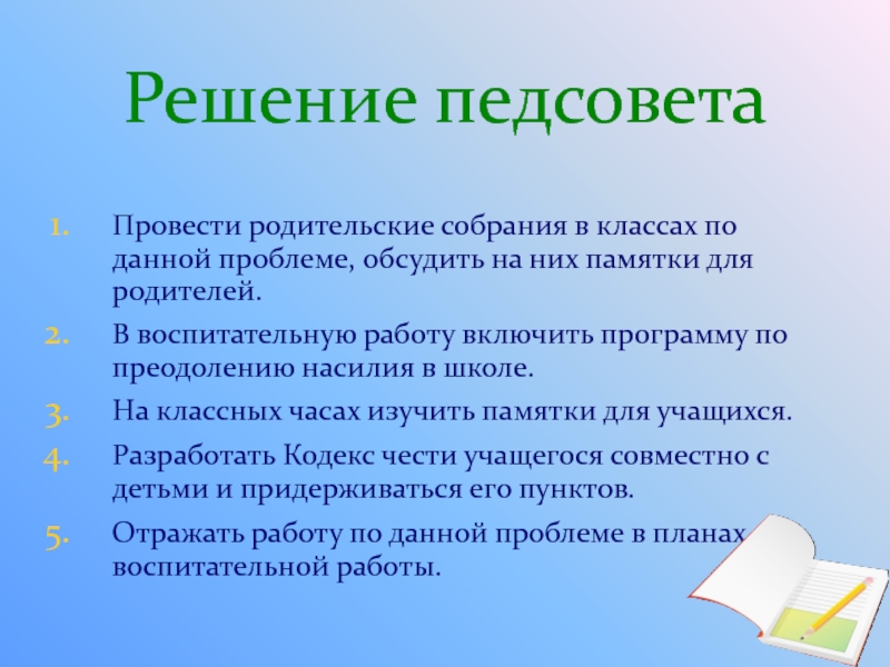 В воспитательную работу включить программу по преодолению насилия в школе.