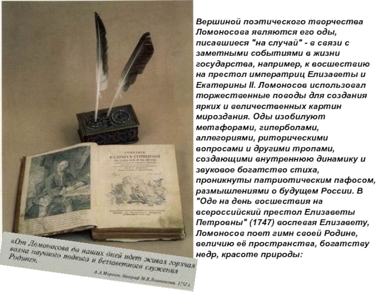 Как поэт Ломоносов воспевал то, над чем работал как ученый: "великое северное сияние", "пользу стекла", "превосходство новоизобретенной артиллерии пред старою" и т.п.