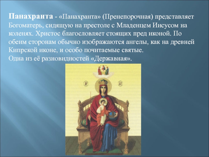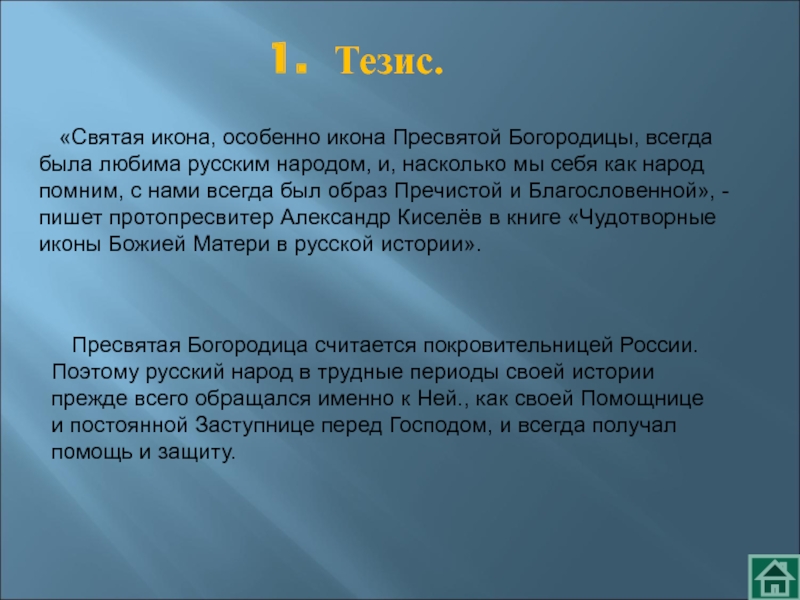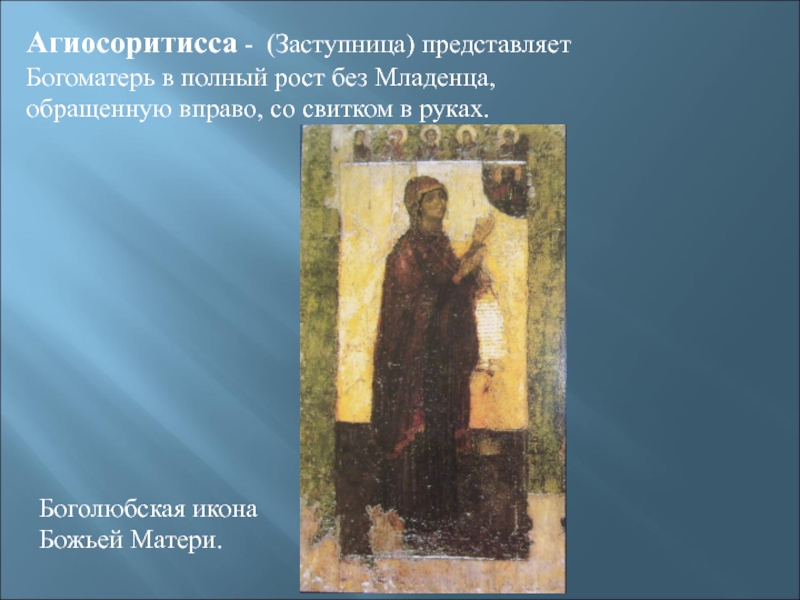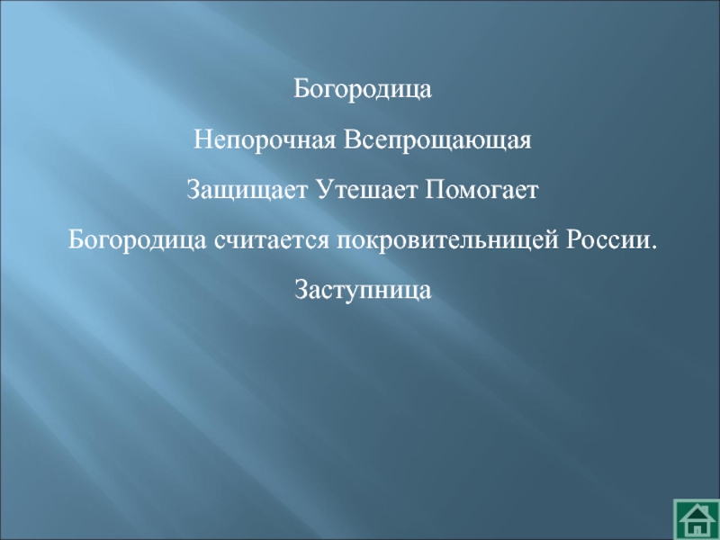 Пресвятая Богородица считается покровительницей России. Поэтому русский народ в трудные периоды своей истории прежде всего обращался именно к Ней., как своей Помощнице и постоянной Заступнице перед Господом, и всегда получал помощь и защиту.
