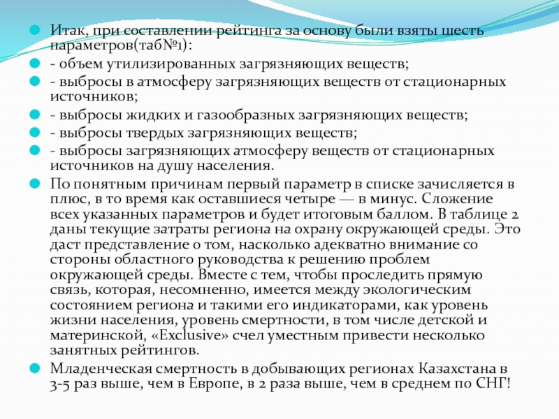 По понятным причинам первый параметр в списке зачисляется в плюс, в то время как оставшиеся четыре — в минус. Сложение всех указанных параметров и будет итоговым баллом. В таблице 2 даны текущие затраты региона на охрану окружающей среды. Это даст представление о том, насколько адекватно внимание со стороны областного руководства к решению проблем окружающей среды. Вместе с тем, чтобы проследить прямую связь, которая, несомненно, имеется между экологическим состоянием региона и такими его индикаторами, как уровень жизни населения, уровень смертности, в том числе детской и материнской, «Exclusive» счел уместным привести несколько занятных рейтингов.