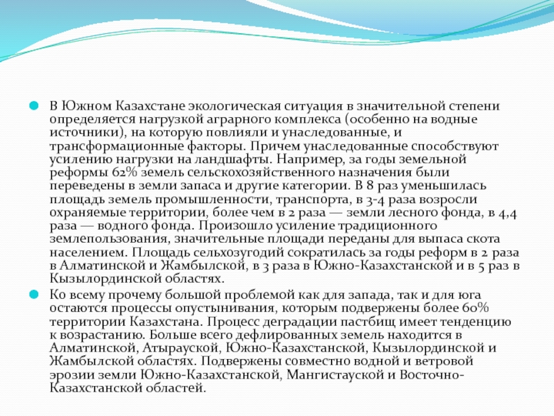 комплекса (особенно на водные источники), на которую повлияли и унаследованные, и трансформационные факторы. Причем унаследованные способствуют усилению нагрузки на ландшафты. Например, за годы земельной реформы 62% земель сельскохозяйственного назначения были переведены в земли запаса и другие категории. В 8 раз уменьшилась площадь земель промышленности, транспорта, в 3-4 раза возросли охраняемые территории, более чем в 2 раза — земли лесного фонда, в 4,4 раза — водного фонда. Произошло усиление традиционного землепользования, значительные площади переданы для выпаса скота населением. Площадь сельхозугодий сократилась за годы реформ в 2 раза в Алматинской и Жамбылской, в 3 раза в Южно-Казахстанской и в 5 раз в Кызылординской областях.