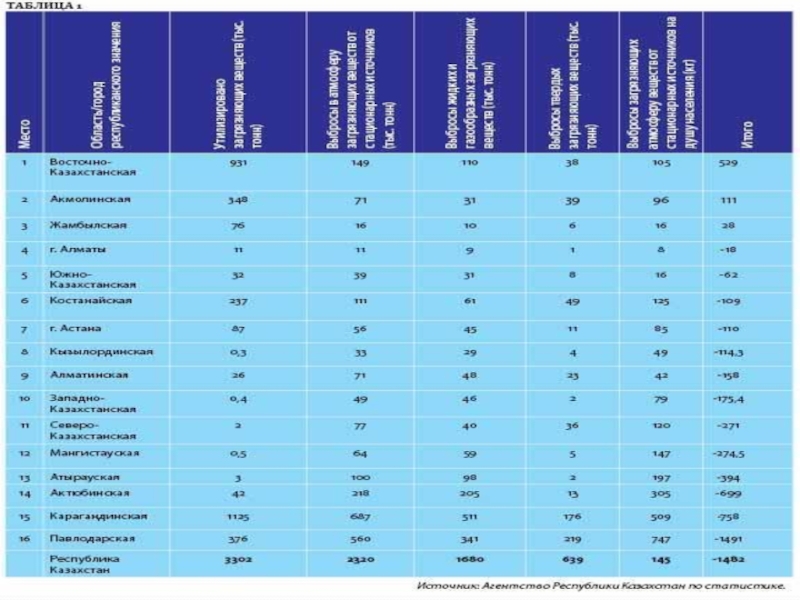 углем, рудами черных и цветных металлов привела к тому, что на протяжении десятилетий в Центральном и Северо-Восточном Казахстане формировались утяжеленная структура промышленности и самые высокие уровни антропогенного загрязнения. Здесь сосредоточены все крупнейшие центры загрязнения атмосферы (73% выбросов от стационарных источников). Город Балхаш, где АО «Завод обработки цветных металлов», производящее более 30 марок меди и ее сплавов, несмотря на внедрение системы менеджмента охраны окружающей среды, сохраняет невысокую степень очистки и, как следствие, дает третью часть всего загрязнения страны. Выплавка титана, магния, свинца и цинка является источником высокотоксичных выбросов (свыше 70 тыс. тонн, что почти равно выбросам Москвы) в Усть-Каменогорске и старейшем на Алтае центре свинцово-цинковой промышленности — городе Риддере, работающих на собственных концентратах. Такая форма организации производства цветных металлов в виде крупных комбинатов полного цикла связана с особенностью руд — низкое содержание чистого металла (1-5%), а рассеянных — даже менее одного. Мрачную картину завершает проблема Семипалатинского ядерного полигона. Сорокалетние испытания ядерного оружия на двух площадках «Балапан» и «Дегелен» причинили невосполнимый ущерб здоровью населения и окружающей среде.