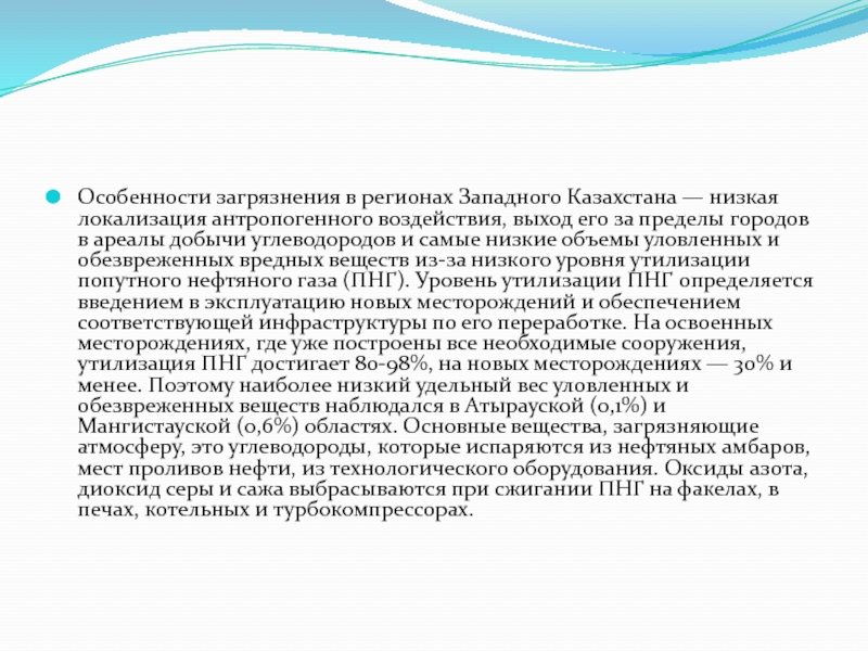 выход его за пределы городов в ареалы добычи углеводородов и самые низкие объемы уловленных и обезвреженных вредных веществ из-за низкого уровня утилизации попутного нефтяного газа (ПНГ). Уровень утилизации ПНГ определяется введением в эксплуатацию новых месторождений и обеспечением соответствующей инфраструктуры по его переработке. На освоенных месторождениях, где уже построены все необходимые сооружения, утилизация ПНГ достигает 80-98%, на новых месторождениях — 30% и менее. Поэтому наиболее низкий удельный вес уловленных и обезвреженных веществ наблюдался в Атырауской (0,1%) и Мангистауской (0,6%) областях. Основные вещества, загрязняющие атмосферу, это углеводороды, которые испаряются из нефтяных амбаров, мест проливов нефти, из технологического оборудования. Оксиды азота, диоксид серы и сажа выбрасываются при сжигании ПНГ на факелах, в печах, котельных и турбокомпрессорах.