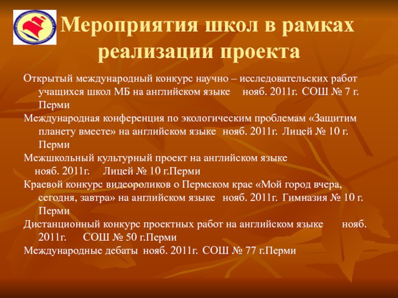 Дистанционный конкурс проектных работ на английском языке нояб. 2011г. СОШ № 50 г.Перми