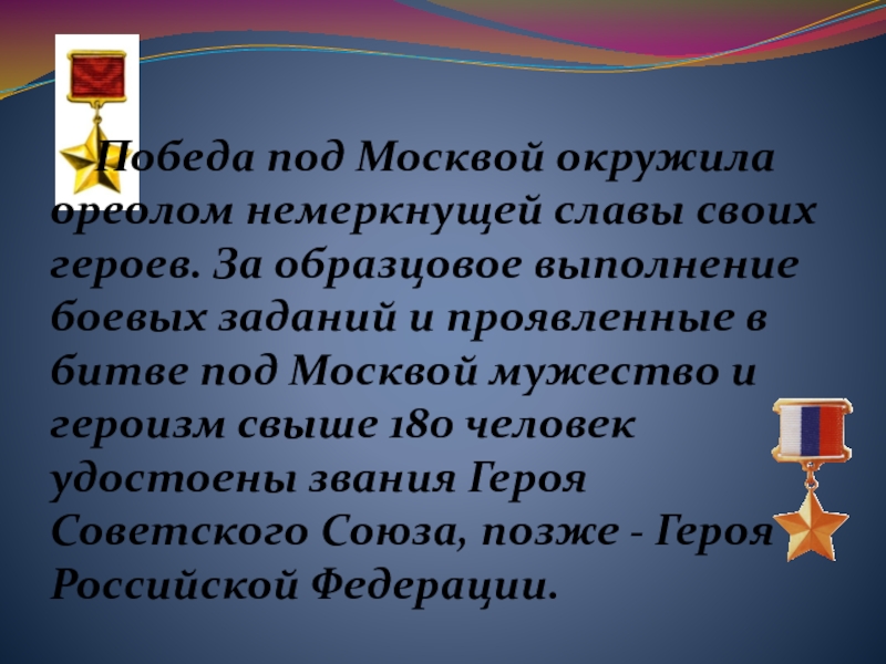 Слайд 10 Победа под Москвой окружила ореолом немеркнущей славы своих героев. За образцовое