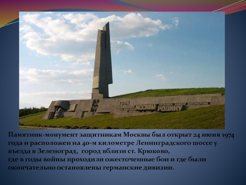 Слайд 12Памятник-монумент защитникам Москвы был открыт 24 июня 1974 года и расположен