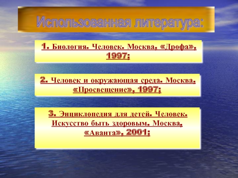 3. Энциклопедия для детей. Человек. Искусство быть здоровым. Москва, «Аванта», 2001;