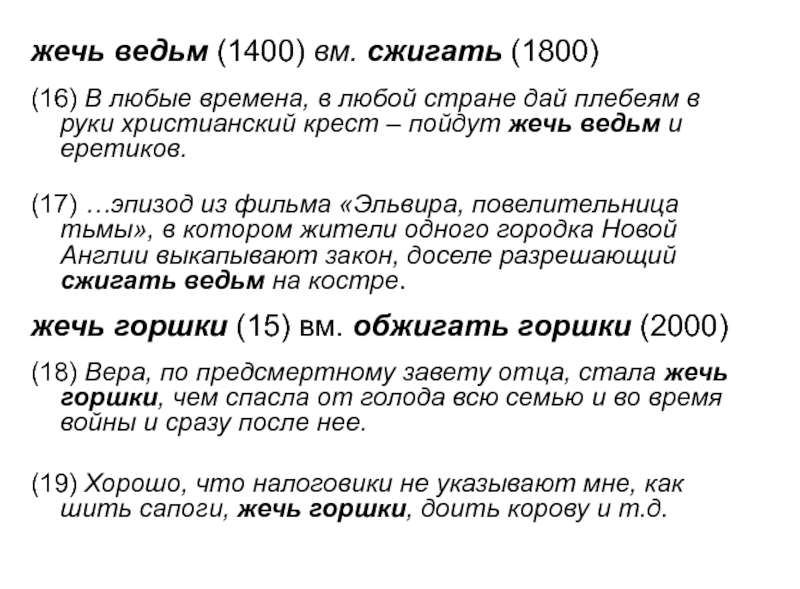 Слайд 13жечь ведьм (1400) вм. сжигать (1800)