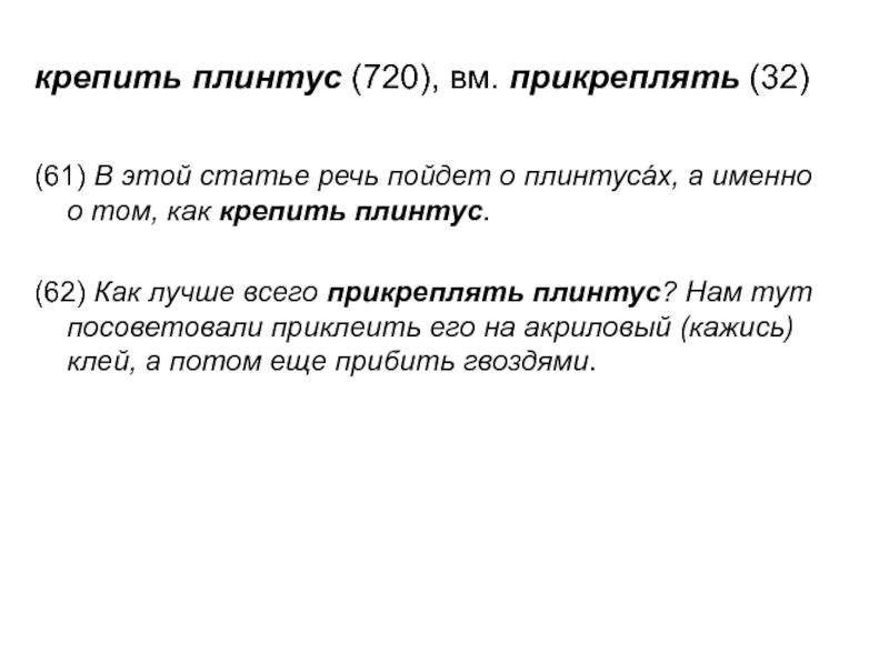 Слайд 23крепить плинтус (720), вм. прикреплять (32)