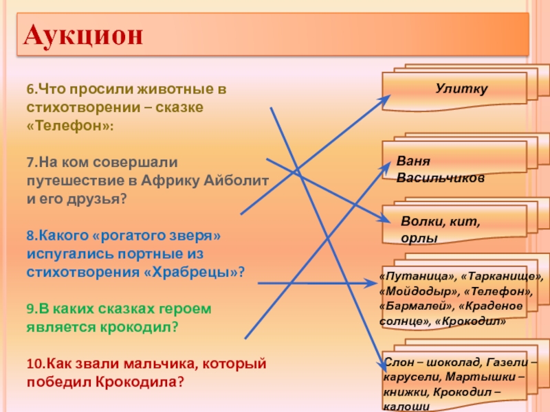«Путаница», «Тарканище», «Мойдодыр», «Телефон», «Бармалей», «Краденое солнце», «Крокодил»