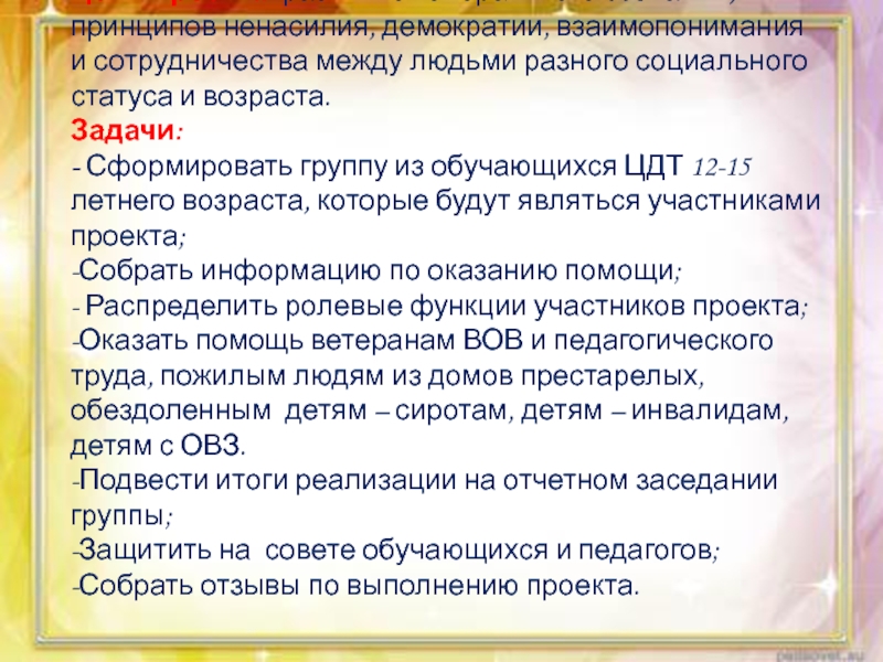 -Оказать помощь ветеранам ВОВ и педагогического труда, пожилым людям из домов престарелых, обездоленным детям – сиротам, детям – инвалидам, детям с ОВЗ.