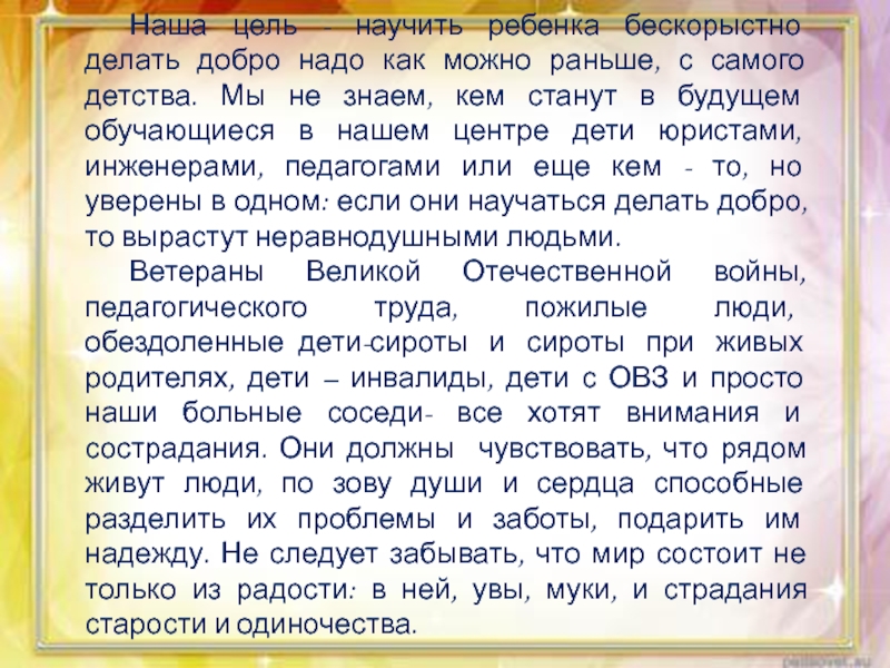 Ветераны Великой Отечественной войны, педагогического труда, пожилые люди, обездоленные дети-сироты и сироты при живых родителях, дети – инвалиды, дети с ОВЗ и просто наши больные соседи- все хотят внимания и сострадания. Они должны чувствовать, что рядом живут люди, по зову души и сердца способные разделить их проблемы и заботы, подарить им надежду. Не следует забывать, что мир состоит не только из радости: в ней, увы, муки, и страдания старости и одиночества.