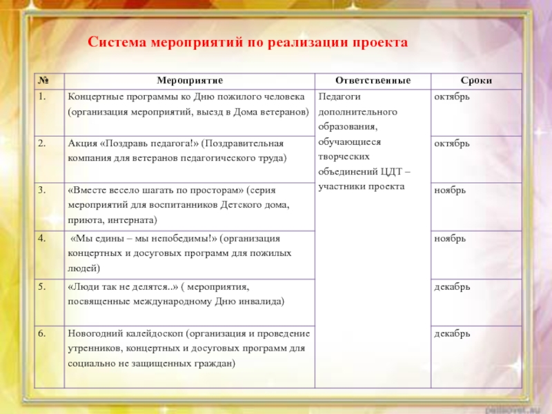 по правонарушениям, детской безнадзорности, пропаганде здорового образа жизни, оказывается психологическая помощь, проводятся консультации, тренинги с детьми и подростками, оказывается моральная и посильная помощь ветеранам ВОВ, пожилым людям. Все эти мероприятия осуществляются в течение всего времени реализации проекта.