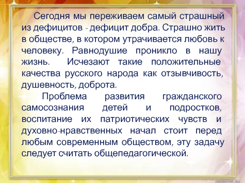Слайд 2Сегодня мы переживаем самый страшный из дефицитов - дефицит добра. Страшно
