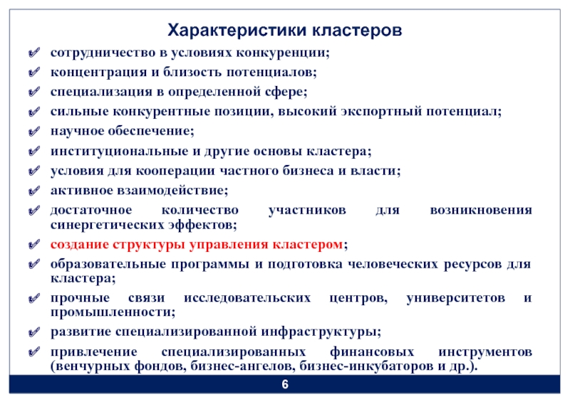1. Развитие механизмов финансовой поддержки реализации кластерной политики на федеральном уровне;