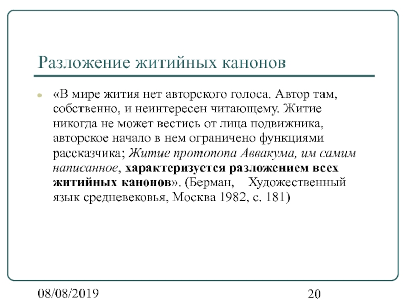 и неинтересен читающему. Житие никогда не может вестись от лица подвижника, авторское начало в нем ограничено функциями рассказчика; Житие протопопа Аввакума, им самим написанное, характеризуется разложением всех житийных канонов». (Берман, Художественный язык средневековья, Москва 1982, с. 181)