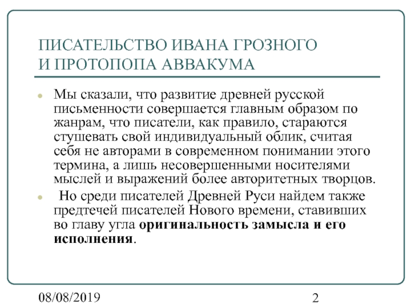 русской письменности совершается главным образом по жанрам, что писатели, как правило, стараются стушевать свой индивидуальный облик, считая себя не авторами в современном понимании этого термина, а лишь несовершенными носителями мыслей и выражений более авторитетных творцов.