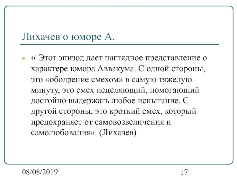 юмора Аввакума. С одной стороны, это «ободрение смехом» в самую тяжелую минуту, это смех исцеляющий, помогающий достойно выдержать любое испытание. С другой стороны, это кроткий смех, который предохраняет от самовозвеличения и самолюбования». (Лихачев)