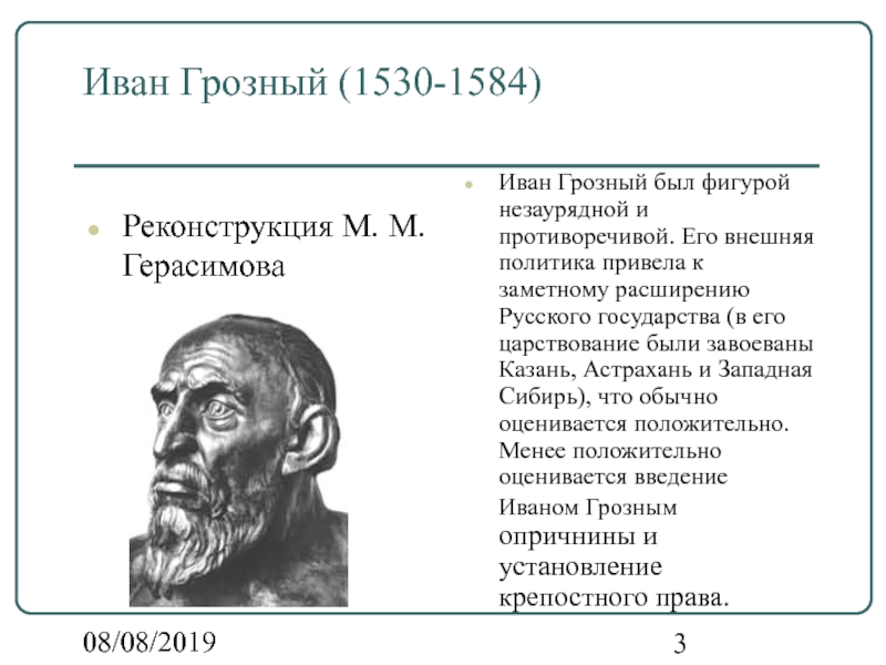 противоречивой. Его внешняя политика привела к заметному расширению Русского государства (в его царствование были завоеваны Казань, Астрахань и Западная Сибирь), что обычно оценивается положительно. Менее положительно оценивается введение Иваном Грозным опричнины и установление крепостного права.