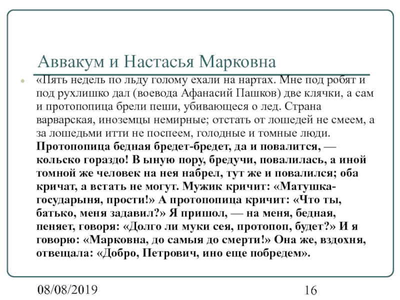 Мне под робят и под рухлишко дал (воевода Афанасий Пашков) две клячки, а сам и протопопица брели пеши, убивающеся о лед. Страна варварская, иноземцы немирные; отстать от лошедей не смеем, а за лошедьми итти не поспеем, голодные и томные люди. Протопопица бедная бредет-бредет, да и повалится, — кольско гораздо! В ыную пору, бредучи, повалилась, а иной томной же человек на нея набрел, тут же и повалился; оба кричат, а встать не могут. Мужик кричит: «Матушка-государыня, прости!» А протопопица кричит: «Что ты, батько, меня задавил?» Я пришол, — на меня, бедная, пеняет, говоря: «Долго ли муки сея, протопоп, будет?» И я говорю: «Марковна, до самыя до смерти!» Она же, вздохня, отвещала: «Добро, Петрович, ино еще побредем».