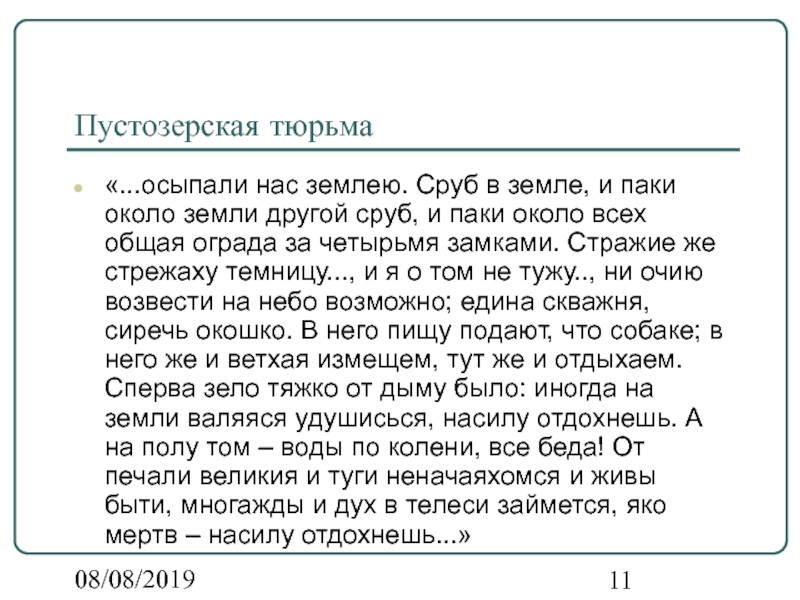 другой сруб, и паки около всех общая ограда за четырьмя замками. Cтражие же стрежаху темницу..., и я о том не тужу.., ни очию возвести на небо возможно; едина скважня, сиречь окошко. В него пищу подают, что собаке; в него же и ветхая измещем, тут же и отдыхаем. Cперва зело тяжко от дыму было: иногда на земли валяяся удушисься, насилу отдохнешь. A на полу том – воды по колени, все беда! Oт печали великия и туги неначаяхомся и живы быти, многажды и дух в телеси займется, яко мертв – насилу отдохнешь...»