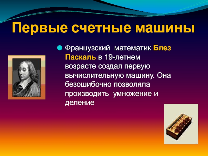 Французский математик Блез Паскаль в 19-летнем возрасте создал первую