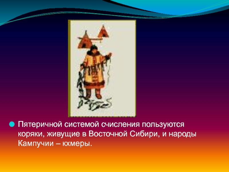 Слайд 14Пятеричной системой счисления пользуются коряки, живущие в Восточной Сибири, и народы